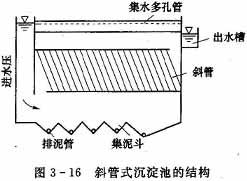 斜管斜板式沉淀池的結(jié)構(gòu)與一般沉淀池相同,是由進口、沉淀區(qū)、出口與集泥區(qū)四個部分組成,只是在沉淀區(qū)設(shè)置有許多斜管或斜板。圖3-16為斜管式沉淀池的典型結(jié)構(gòu)。